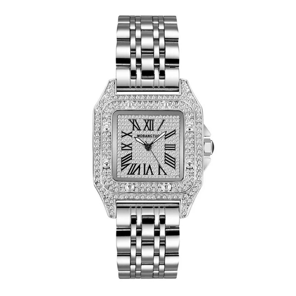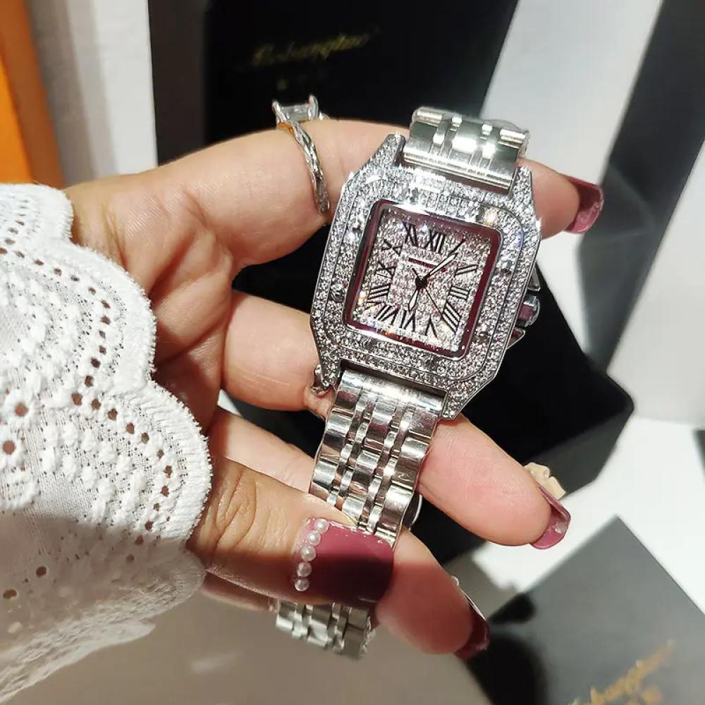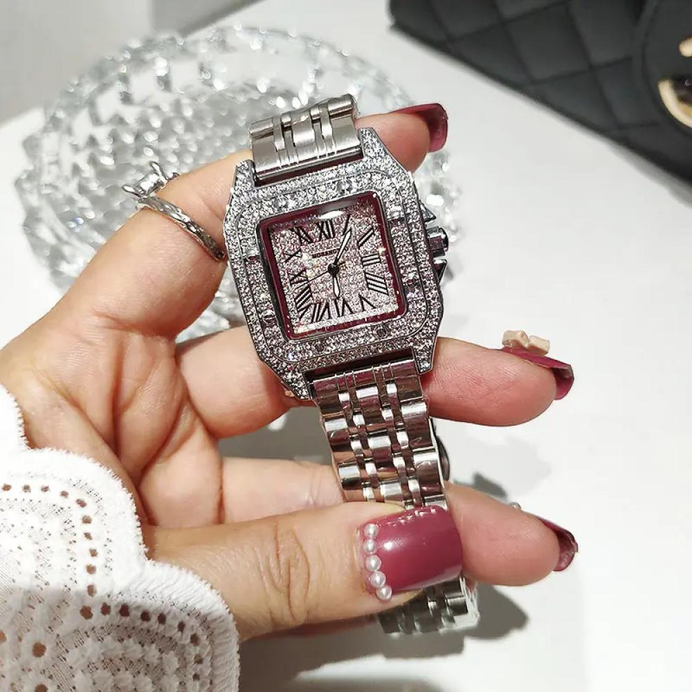 ساعة حجر الراين النسائية بتصميم فاخر تجمع بين الأناقة والجودة العالية حيث تأتي بإطار مربع أنيق مصنوع من مواد متينة مع لمسات راقية من حجر الراين اللامع كما أنها تعمل بحركة كوارتز دقيقة لضمان دقة التوقيت