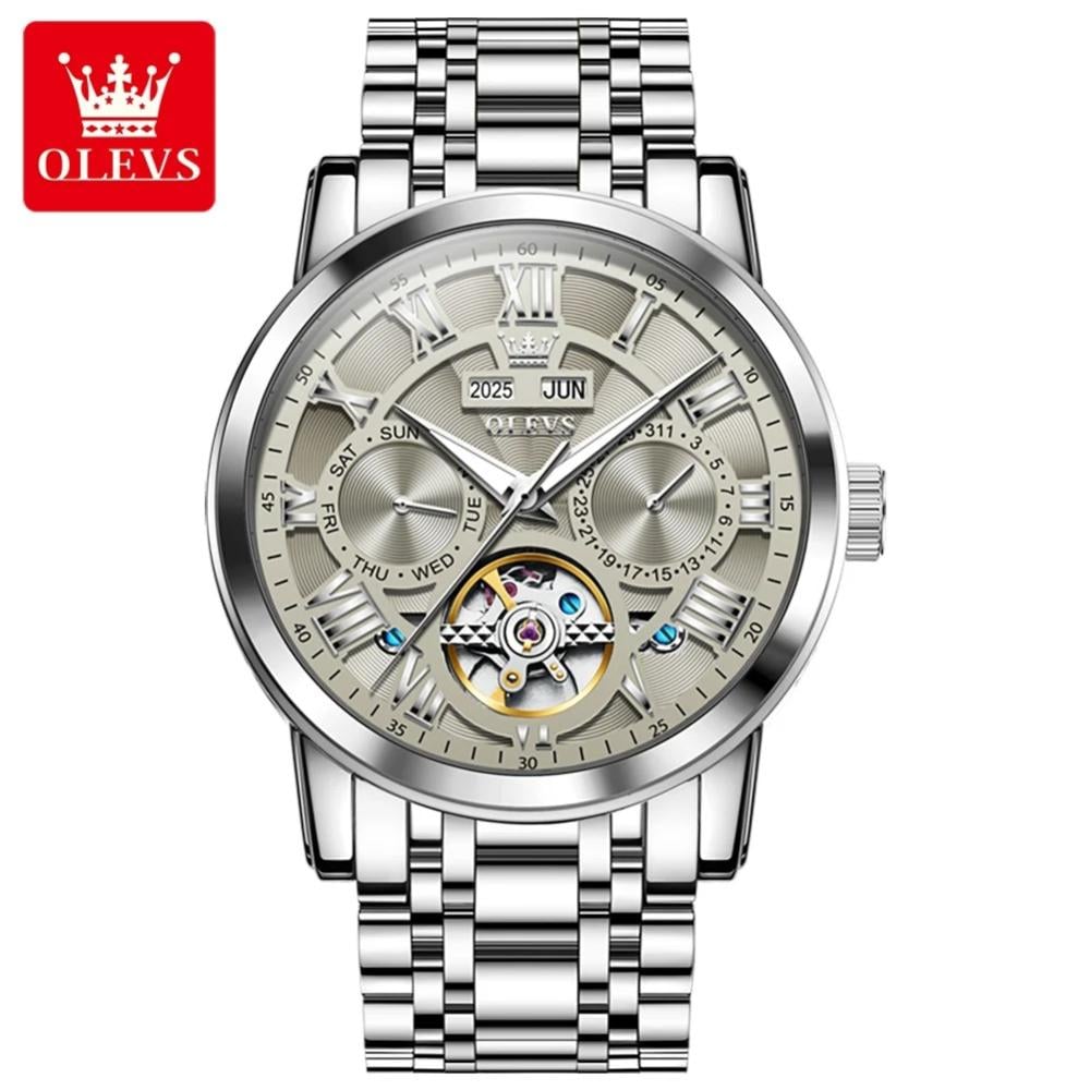 ساعة olevs الأصلية فضى بتصميم فاخر يجمع بين الأناقة والتكنولوجيا الحديثة بهيكل عظمي مكشوف يبرز التفاصيل الدقيقة للحركة الميكانيكية حركة أوتوماتيكية دقيقة توفر أداءً استثنائيًا مع قرص رمادي جذاب